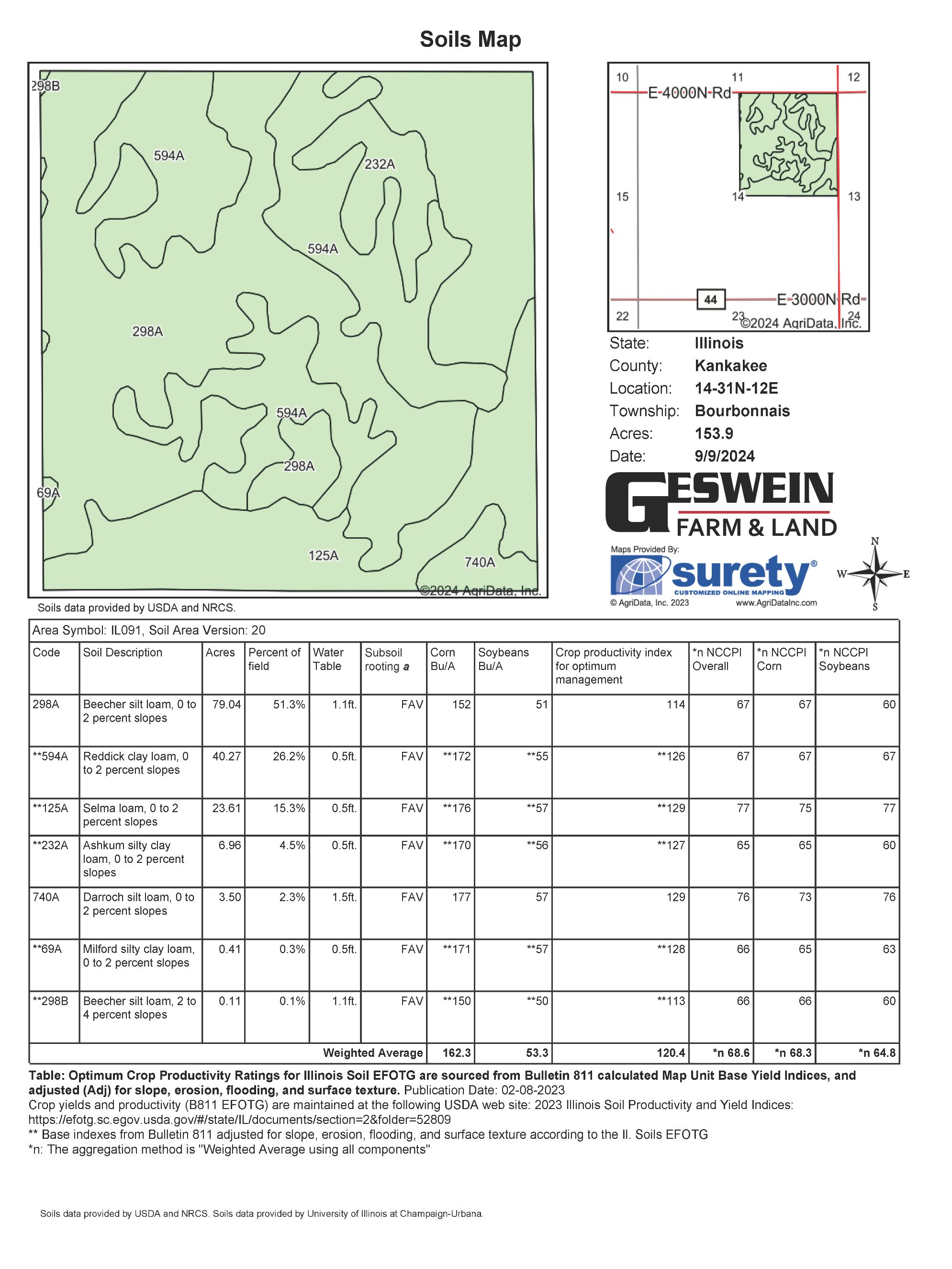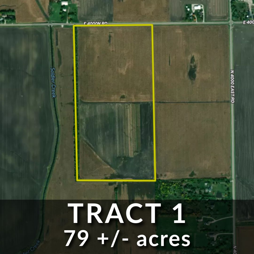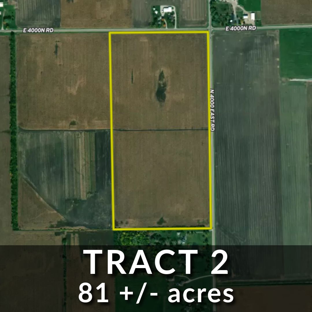 Join us for a farm auction on December 11, 2024, where we are offering two tracts of land located at the corner of E 4000 N Rd and N 4000 E Rd, conveniently situated just east of the Bradley city limits. This property boasts +/- 153.9 acres of FSA Crop Acres, featuring a productivity index of 120.4 - an excellent investment for agricultural use. Additionally, there may be potential develop-ment opportunities worth investigating. Please note that irrigation pivots, pumps, and above-ground piping are not included in the sale of the real estate, though the purchase of irrigation equipment can be negotiated separately. Confidential offers & private sale will be considered prior to auction. Contact Jeremy Thompson to discuss confidential offers at (815) 351 – 5572.