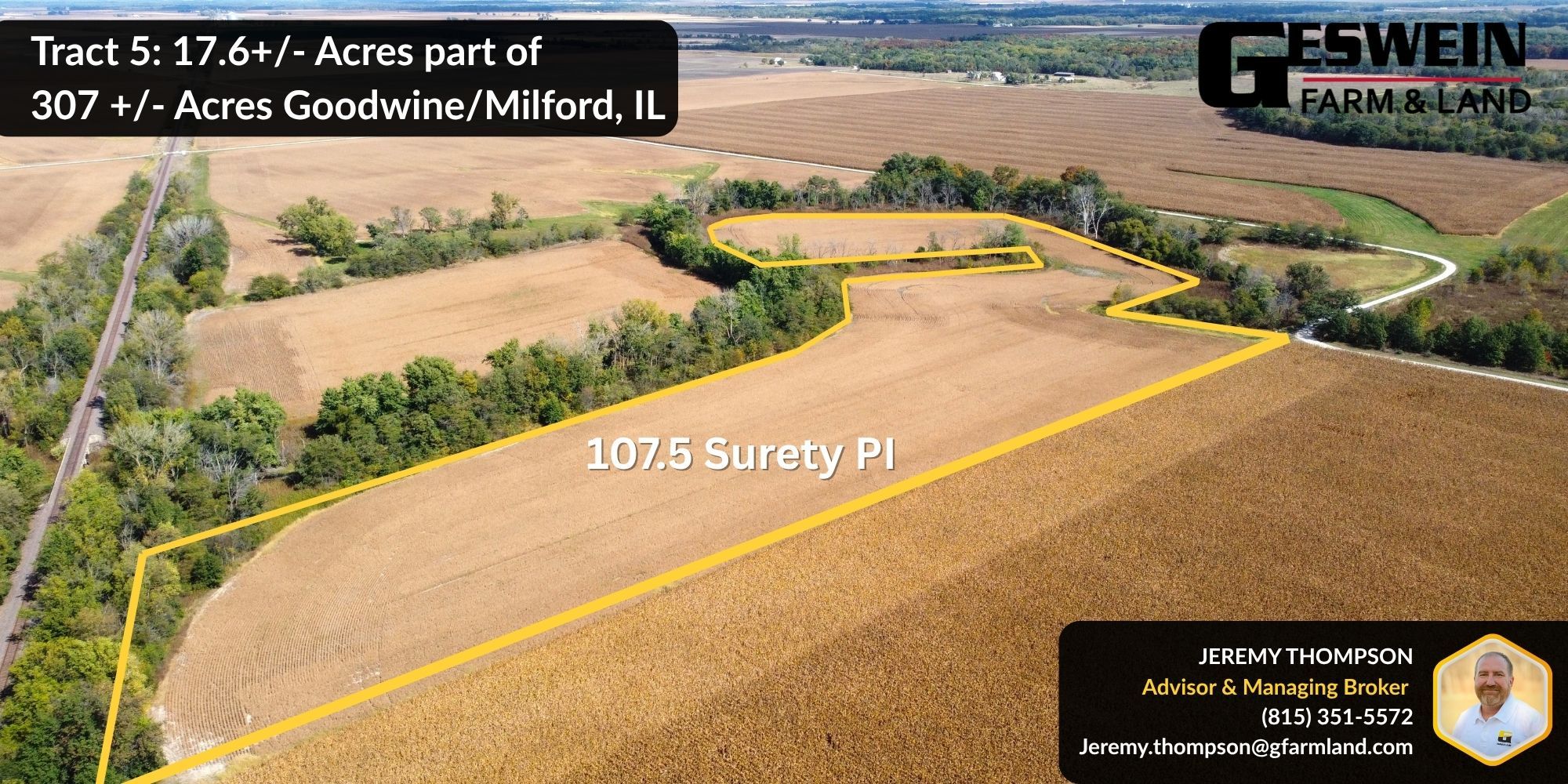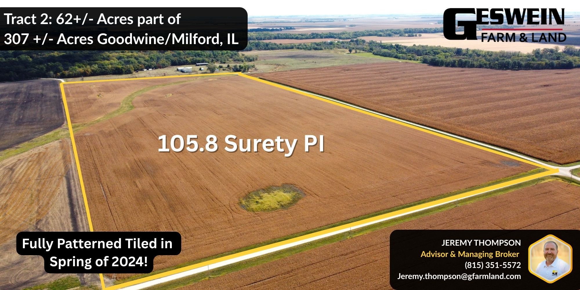 This 307± acre farm offers a strong mix of productivity and investment potential, with primarily tillable acres and mostly Class B soils making it well-suited for both farm operators and land investors. Conveniently located just west of Milford, Illinois, the property sits close to grain markets in Goodwine, providing excellent access and logistics. Most of the farmland was fully pattern tiled in spring 2024, enhancing drainage and long-term yield performance. The farm carries a Surety Productivity Index (PI) of 113.7 and will be sold with an open lease for 2026, giving the new owner flexibility for the next crop year.